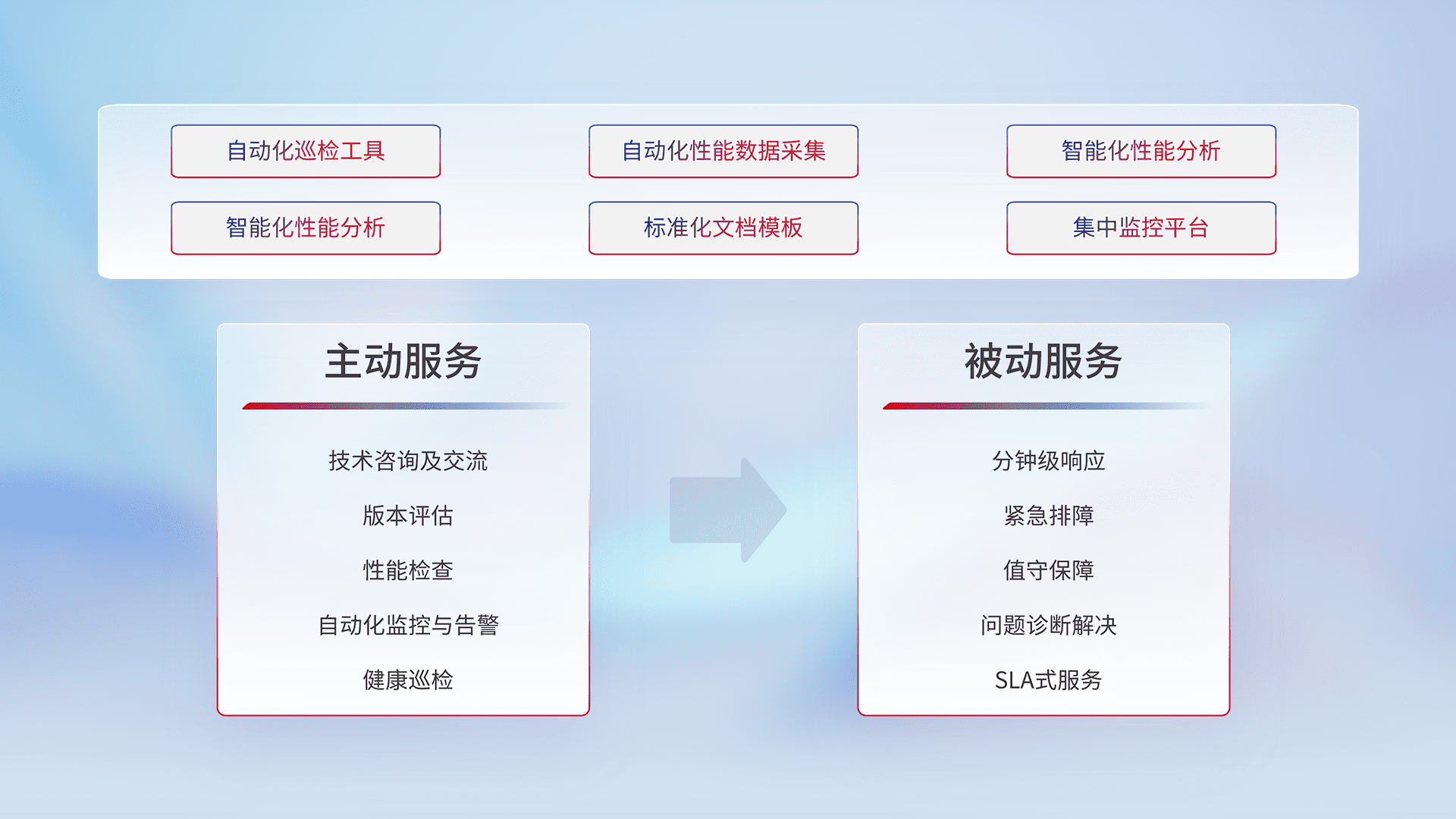 智能化工具和标准化文档,,,,保障服务质量,,,提供主动服务(包含技术咨询、、版本评估、、性能检查、、自动化监控与告警、、健康巡检)和被动服务包含(分钟级响应、、、、紧急排障、、、、值守保障、、、、问题诊断解决、、、、SLA服务)。。。